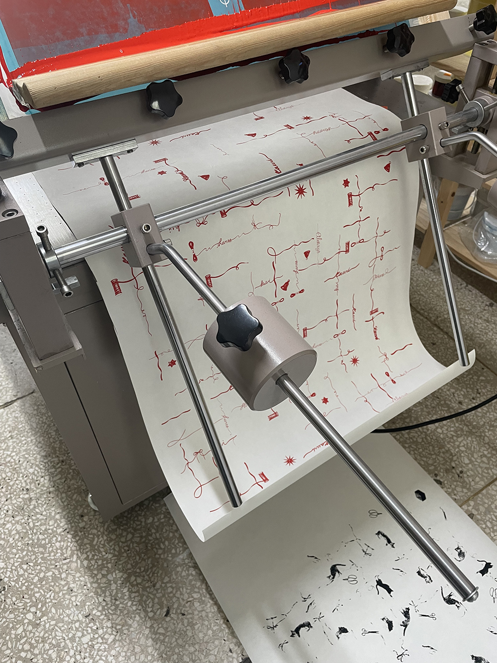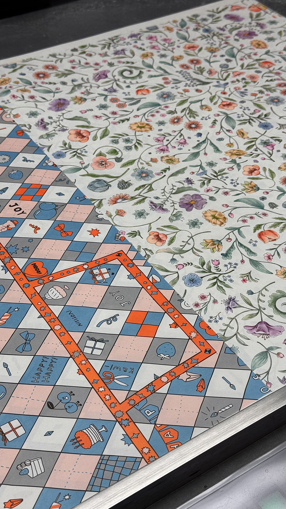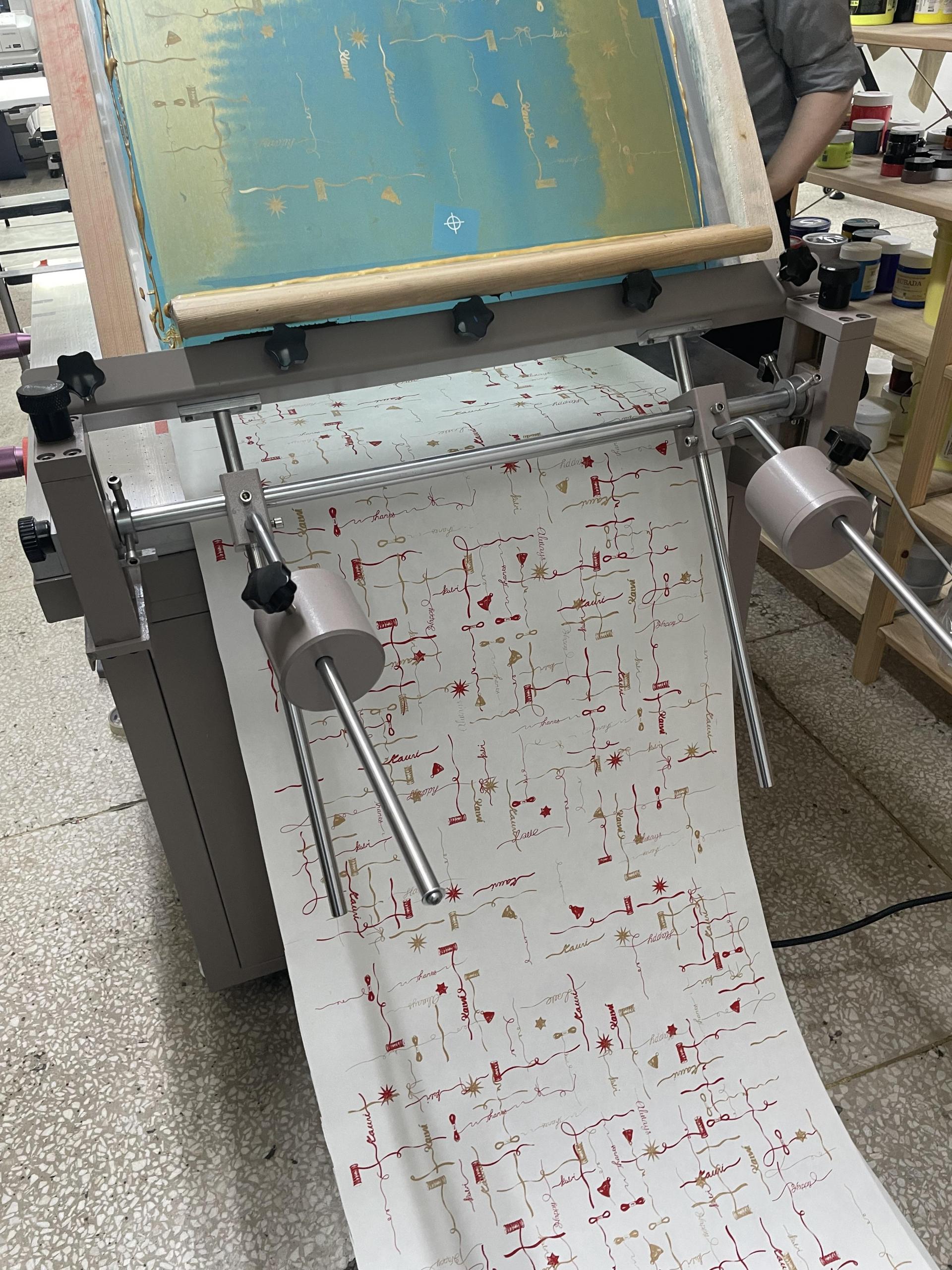 저희 패턴지를 길게 롤로 만들게 되면 어떤 느낌일까 싶어서 실크스크린으로 직접 찍어냈습니다.