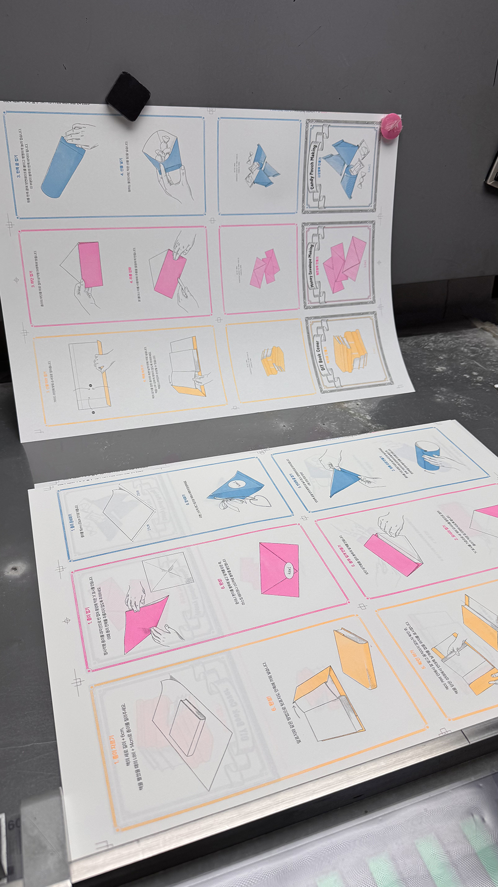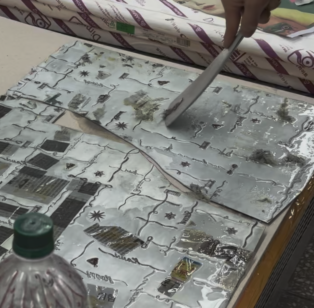 저희 패턴지 Interlude가 금박이 들어가요. 동판을 같이 전시하고 싶어서 박집에서 달라고 했어요. 동판이 워낙 크고 조금이라도 어딘가가 더 눌리면 안되기때문에 공간에 저렇게 본드로 신문지를 붙여서 그걸 방지하더라구요. 저희 인쇄소 이사님이 신문지 떼어주는중이에요. 소스윗!