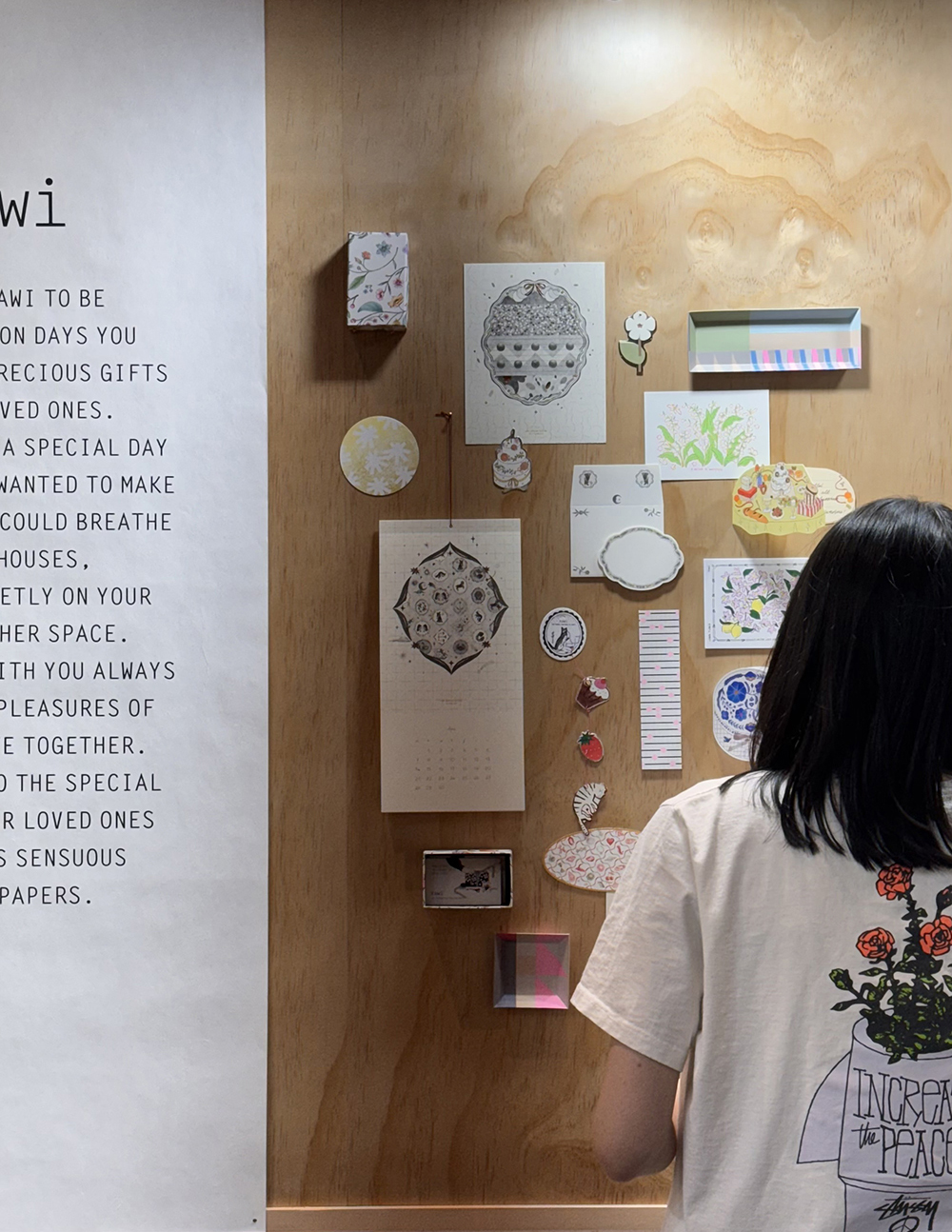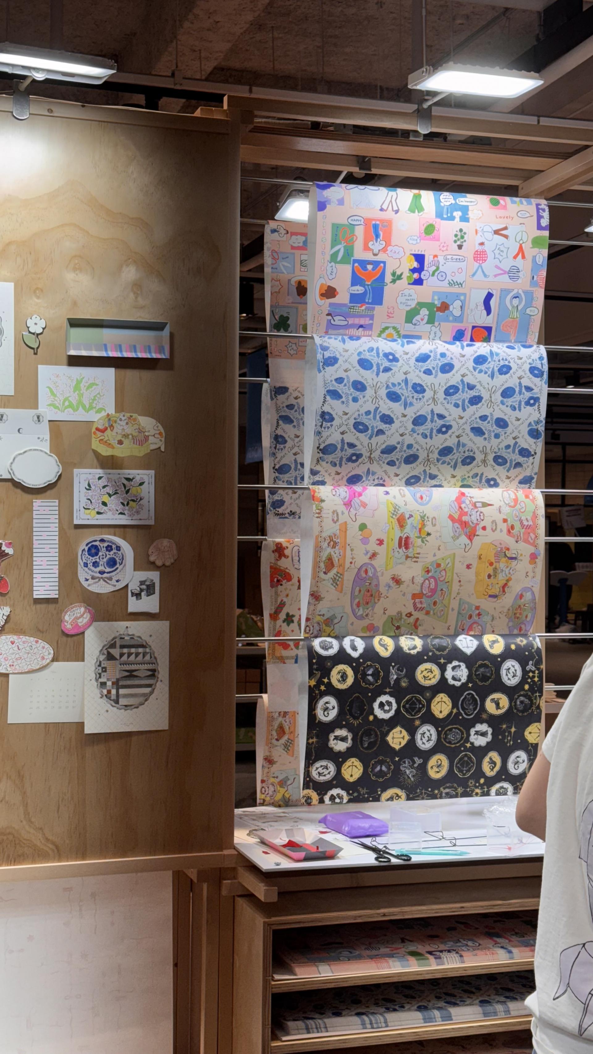 안쪽 보드에는 우리가 디자인했던 것들을 하나씩, 그 중간과정, 패터지로 만든 상자, 트레이들을 무드보드처럼 꾸몄어요. 개인적으로 여기가 제일 좋았어요. 사진에 보이는 저희 디자이너는 이때 출산한지 얼마 안되었던 때라 힘들텐데 제가 징징징거려서 하루 나와서 디스플레이를 도와줬습니다. 🧡