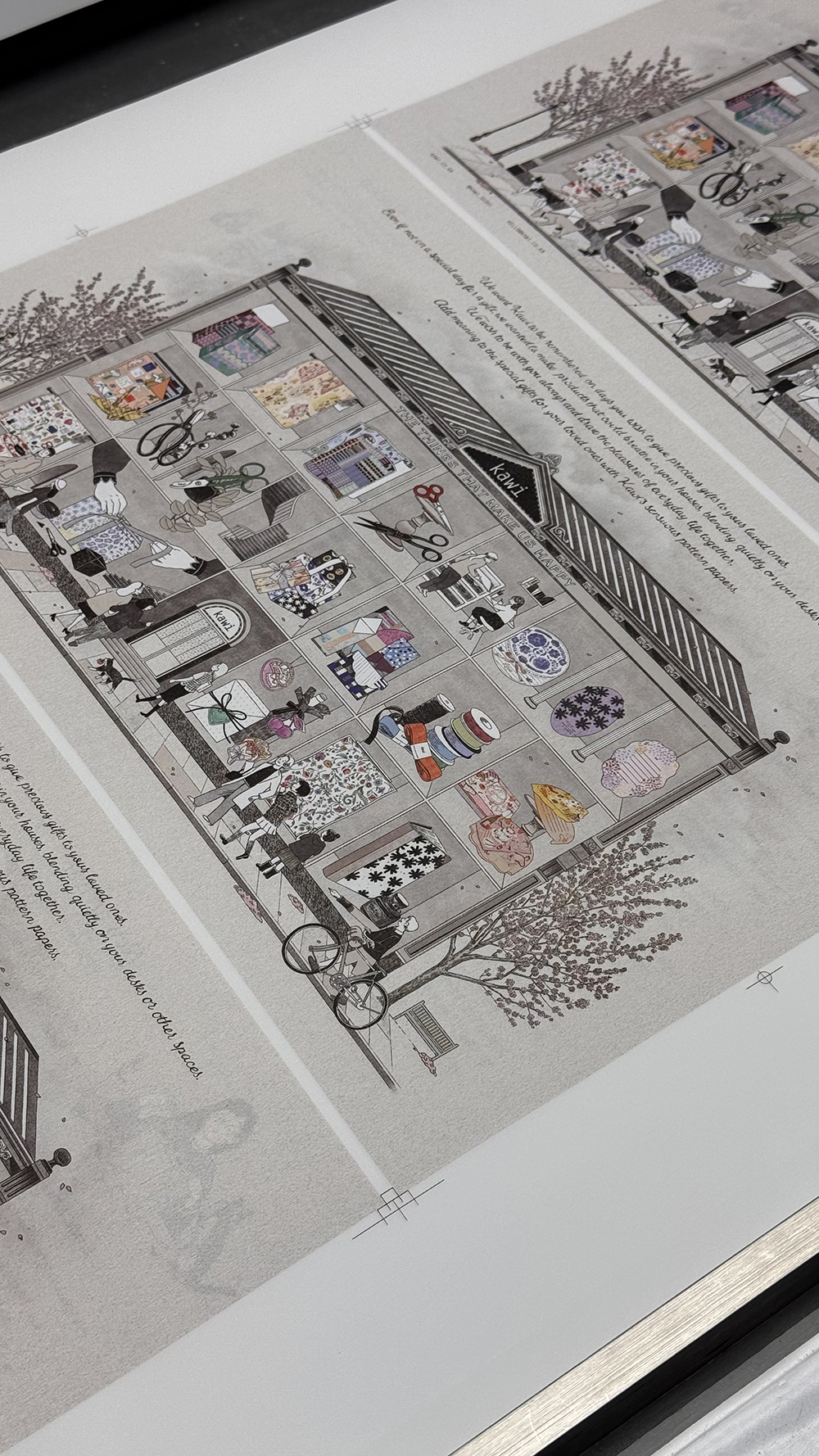 그리고, 저희를 소개하는 방법으로 '가위집'을 그리기 시작했어요. 저희 시그니처 제품이 집의 각 층과 방에 있고 그곳을 방문하는 사람들을 그린 그림인데, 새롭게 만들때마다 계절도 바꿔주고, 제품도 신제품으로 바꿔줬어요. 저희만 아는 포인트! 이때는 봄이 오는 계절이라 벚꽃을 같이 그려줬습니다. 사람들 옷도 조금 얇아졌구요!