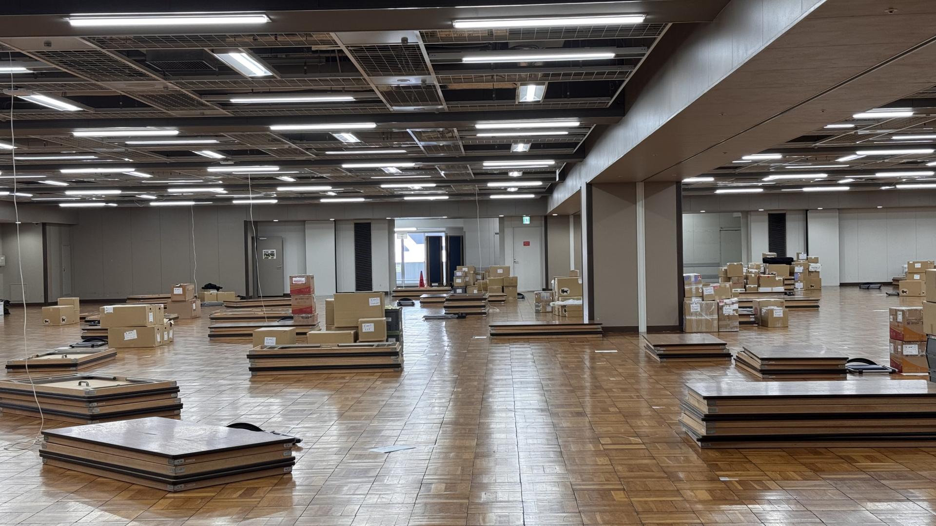 설치 날, 현장에 제일먼저 도착했어요. 각 자리에 테이블들이 접혀져 있네요.